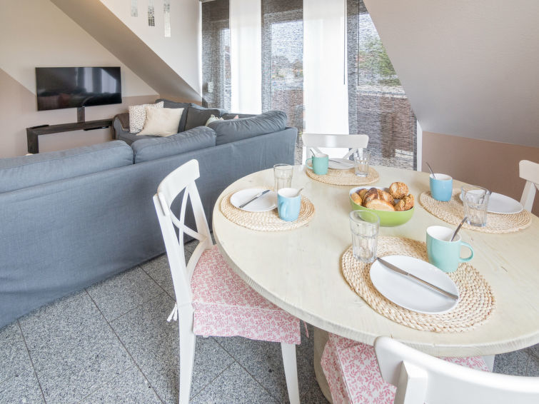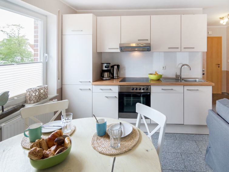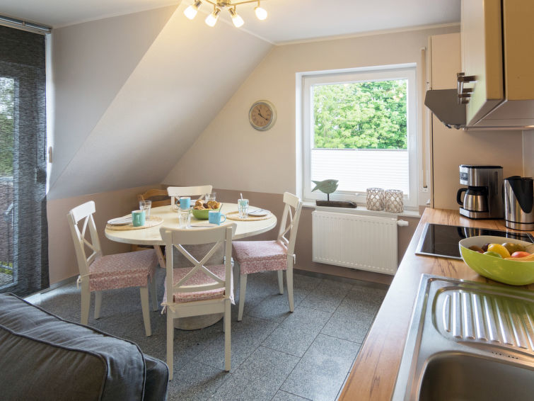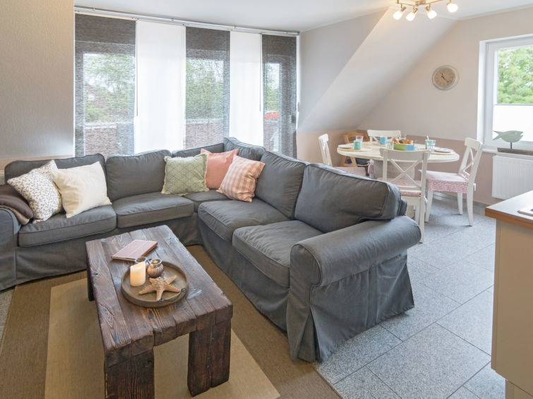 "Meeresrauschen", appartement 3-kamers 64 m2 op 2 verdiepingen op de 1e verdieping. Modern en smaakvol ingericht: woon-/eetkamer 27 m2 met Sat-TV (Flatscreen TV). Uitgang naar het balkon. 1 2-pers. kamer 8 m2. Kookhoek (oven, afwasmachine, 4 keramische glas kookplaten, broodrooster, waterkoker, magnetron, elektrische koffiemachine). Douche/WC. Zolderverdieping: 1 kamer 10 m2, met afgeschuinde daken met 2 bedden en Sat-TV (Flatscreen TV), DVD. Balkonmeubilair. Ter beschikking: wasmachine, strijkijzer, kinderstoel, haardroger. Internet (Internet (WiFi), gratis). Niet rokers woning. Rookmelders.